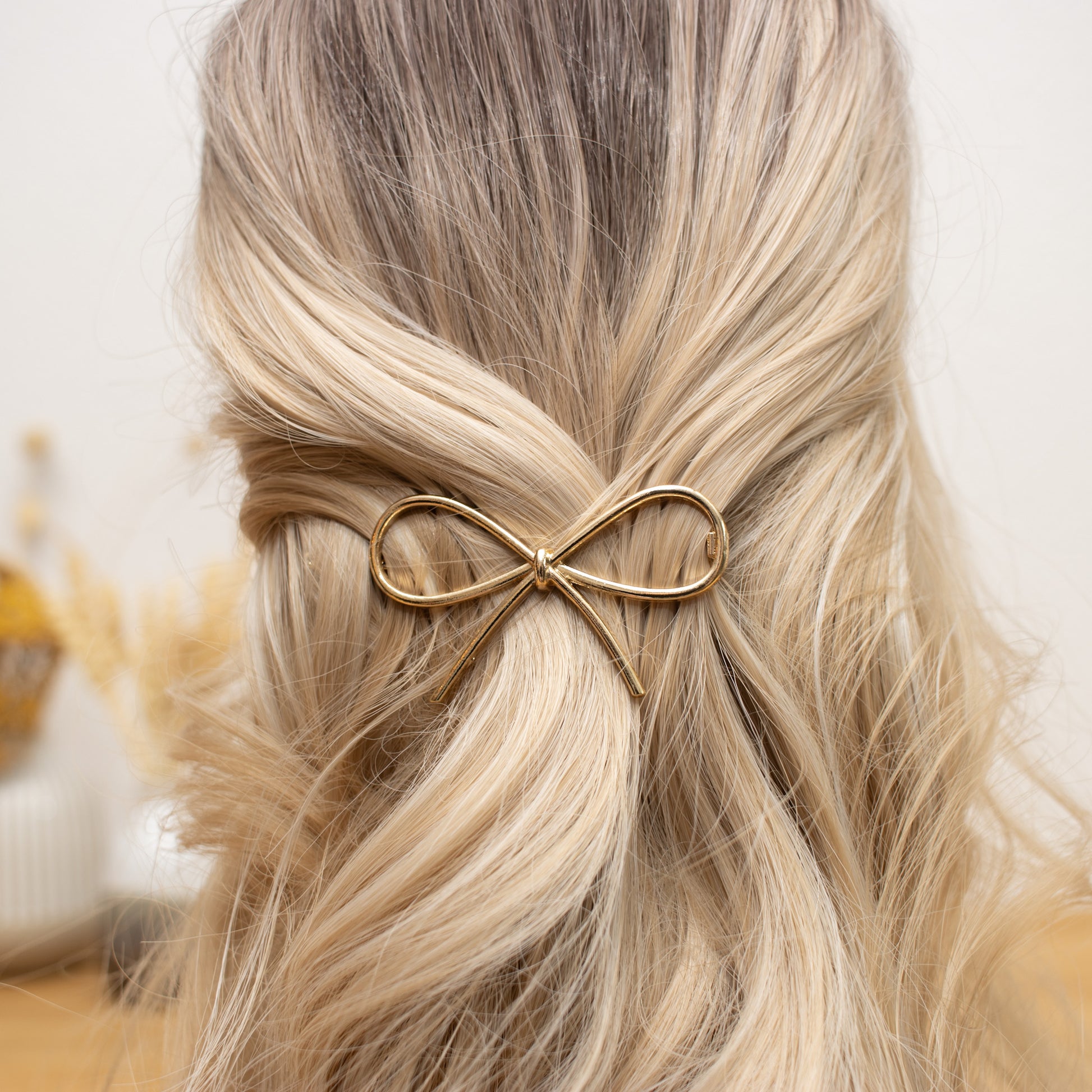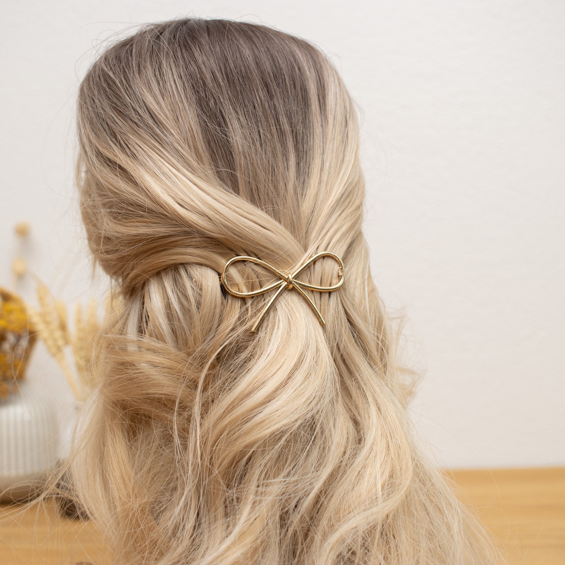 Verleihen Sie Ihrer Frisur eine elegante und charmante Note mit unserer Haarklammer in Form einer Schleife in Goldoptik. Dieses stilvolle Accessoire ist ideal für besondere Anlässe und alltägliche Eleganz.