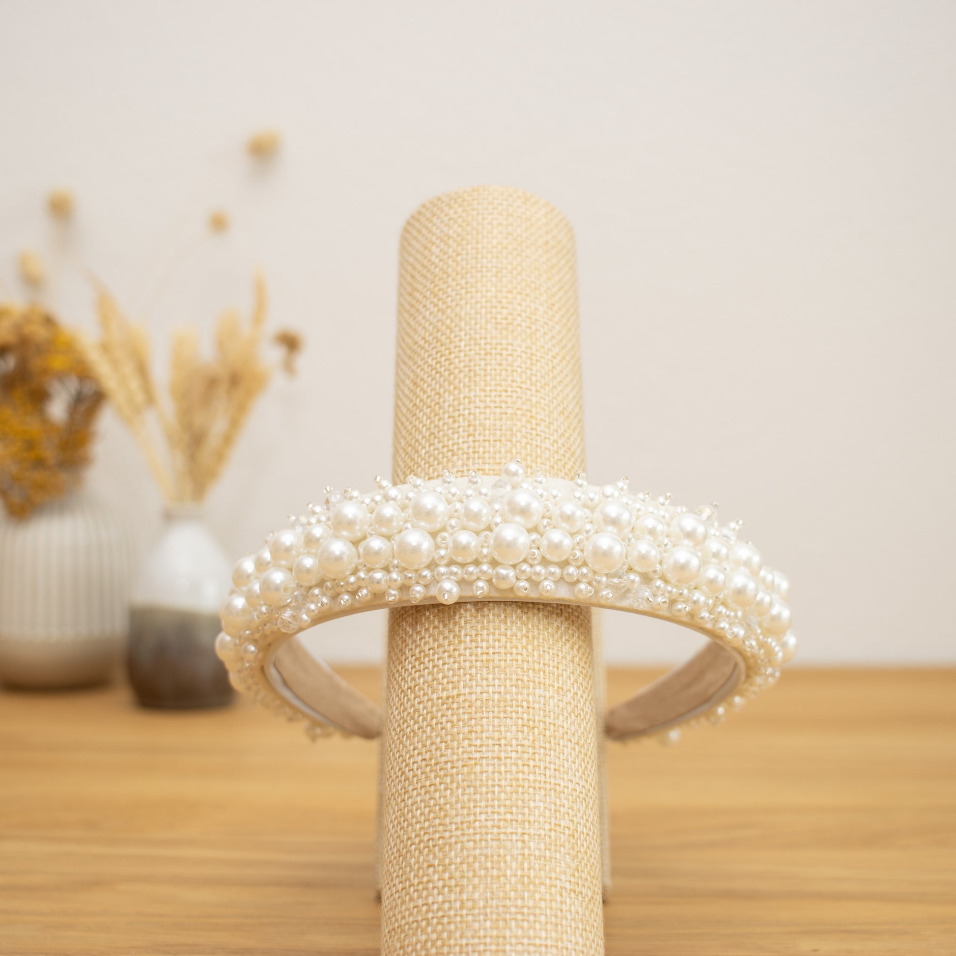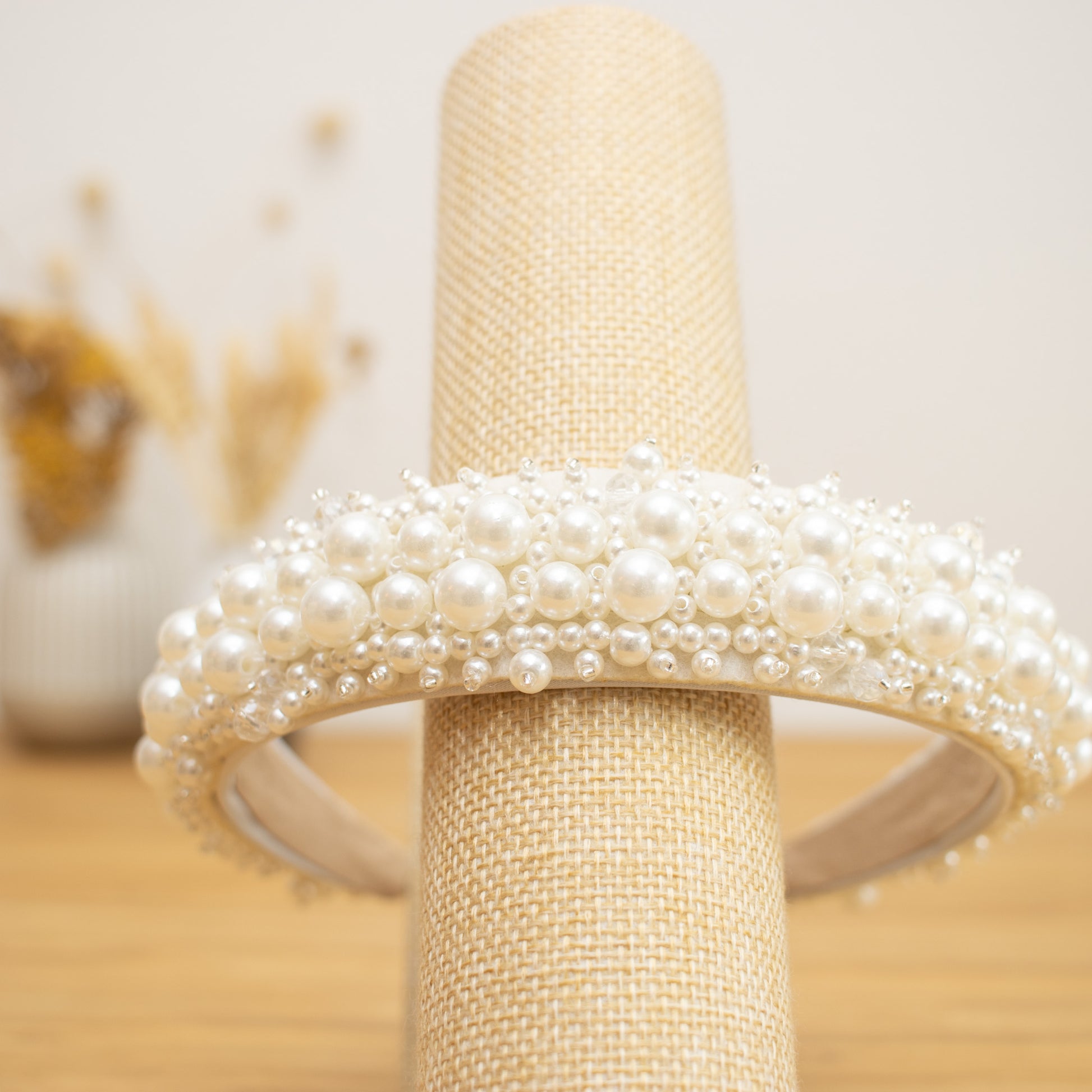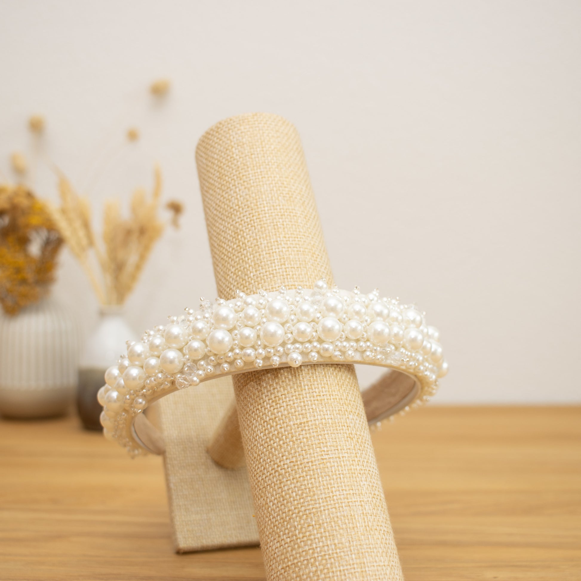 Edles Perlendesign: Der Haarreif ist mit wunderschönen, kunstvoll angeordneten Perlen verziert, die Ihrem Haar einen luxuriösen und eleganten Touch verleihen. Die Perlen schimmern sanft und setzen glänzende Akzente.