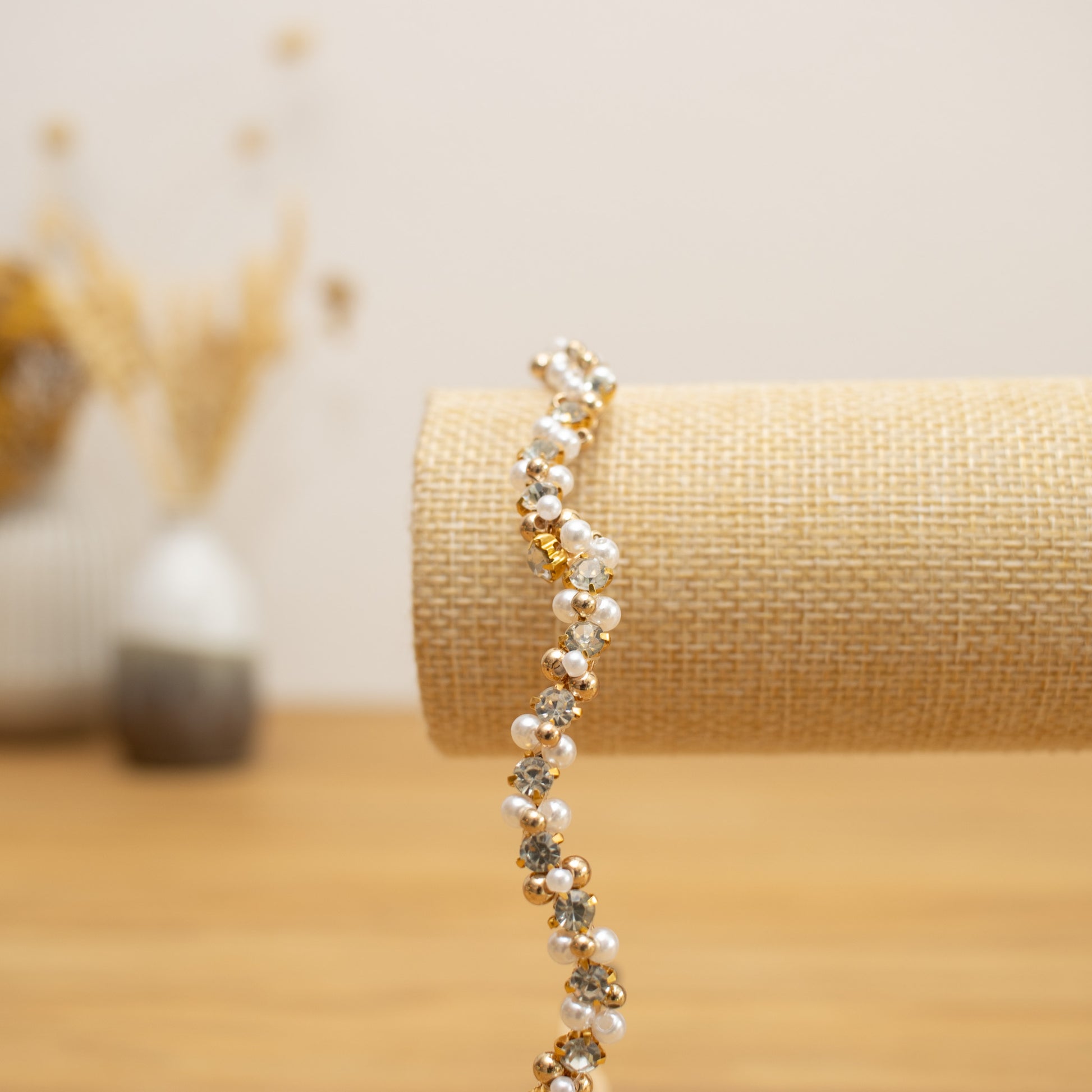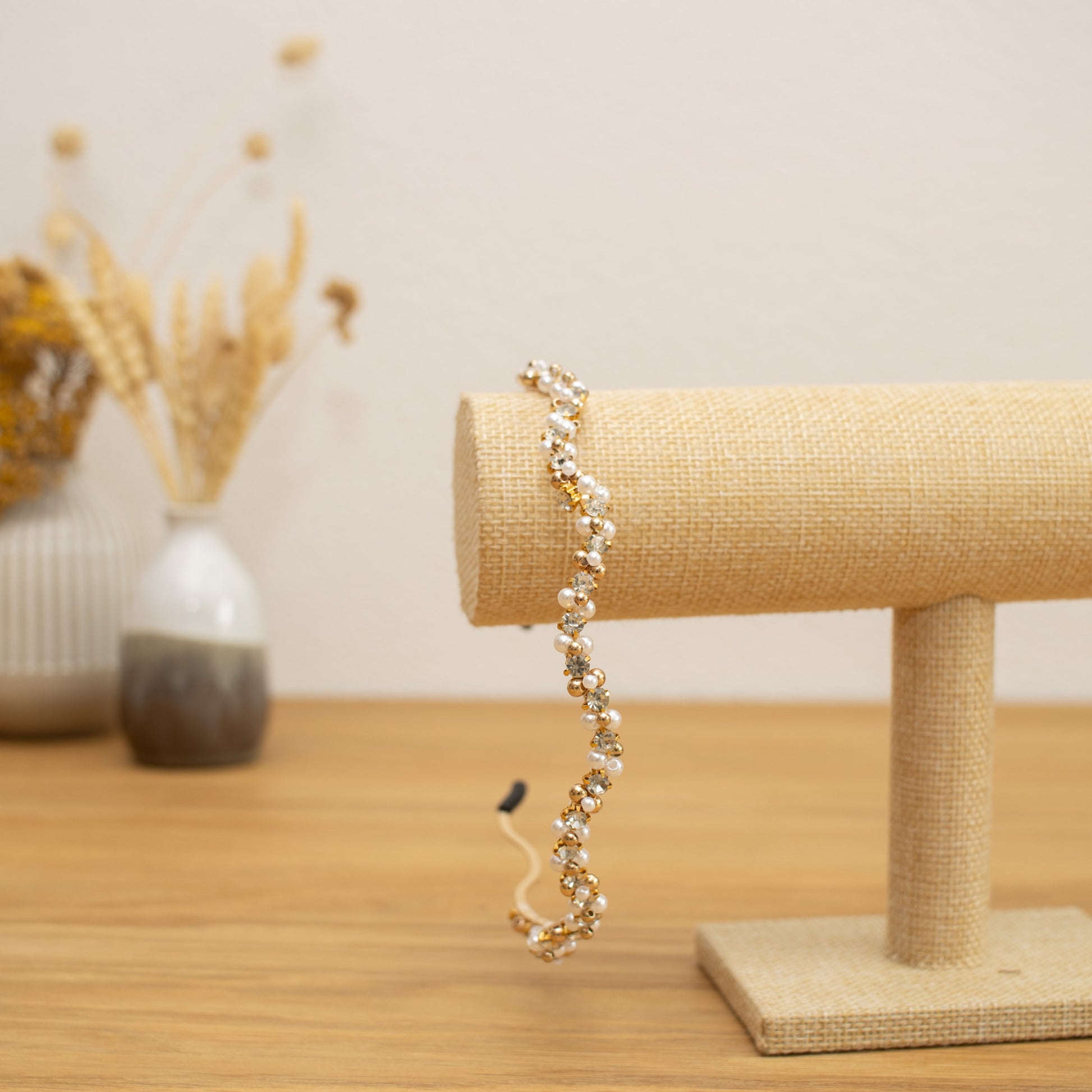- Edles Design: Der Haarreif ist mit feinen, goldfarbenen Details und zarten Perlen verziert. Diese Kombination verleiht Ihrem Haar einen luxuriösen und eleganten Touch.
