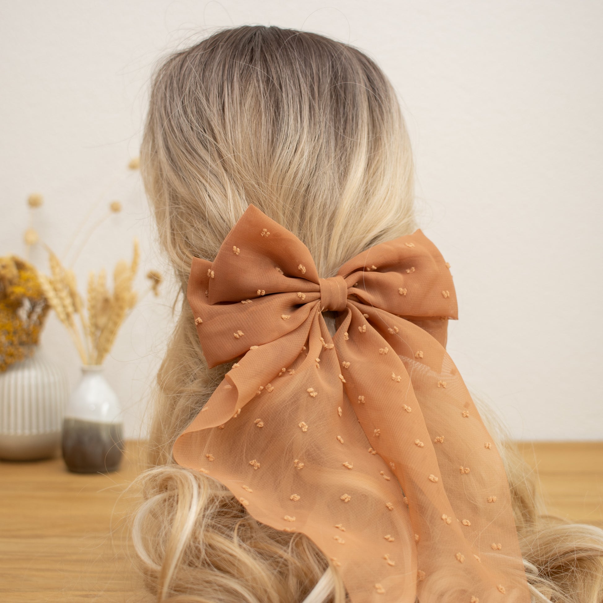 Mit unserer Haarschleife in Braun bringen Sie eine stilvolle und elegante Note in Ihr Haarstyling. Dieses Accessoire ist ein Must-Have für jede Schmuckkollektion und eignet sich hervorragend als Geschenk für sich selbst oder Ihre Liebsten.