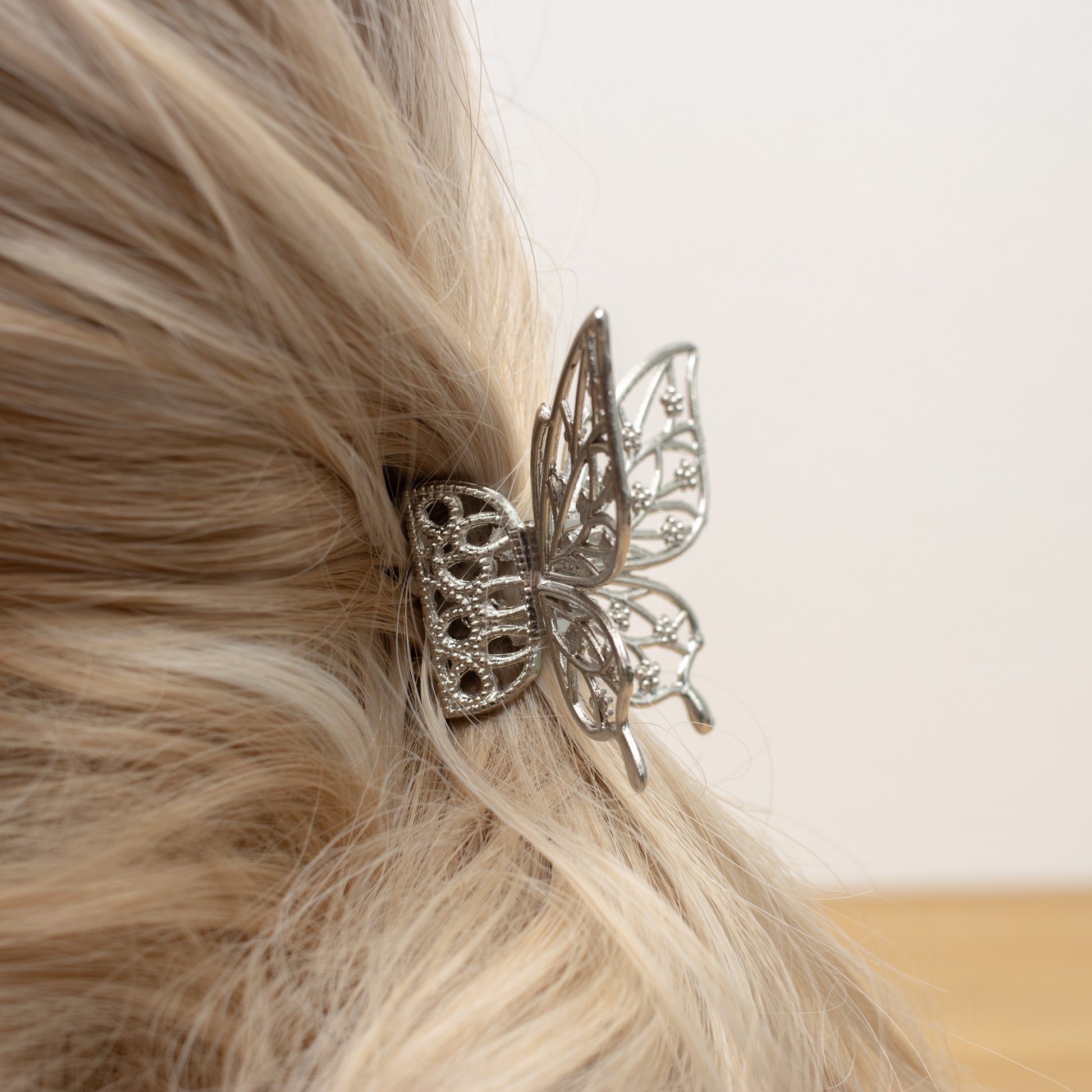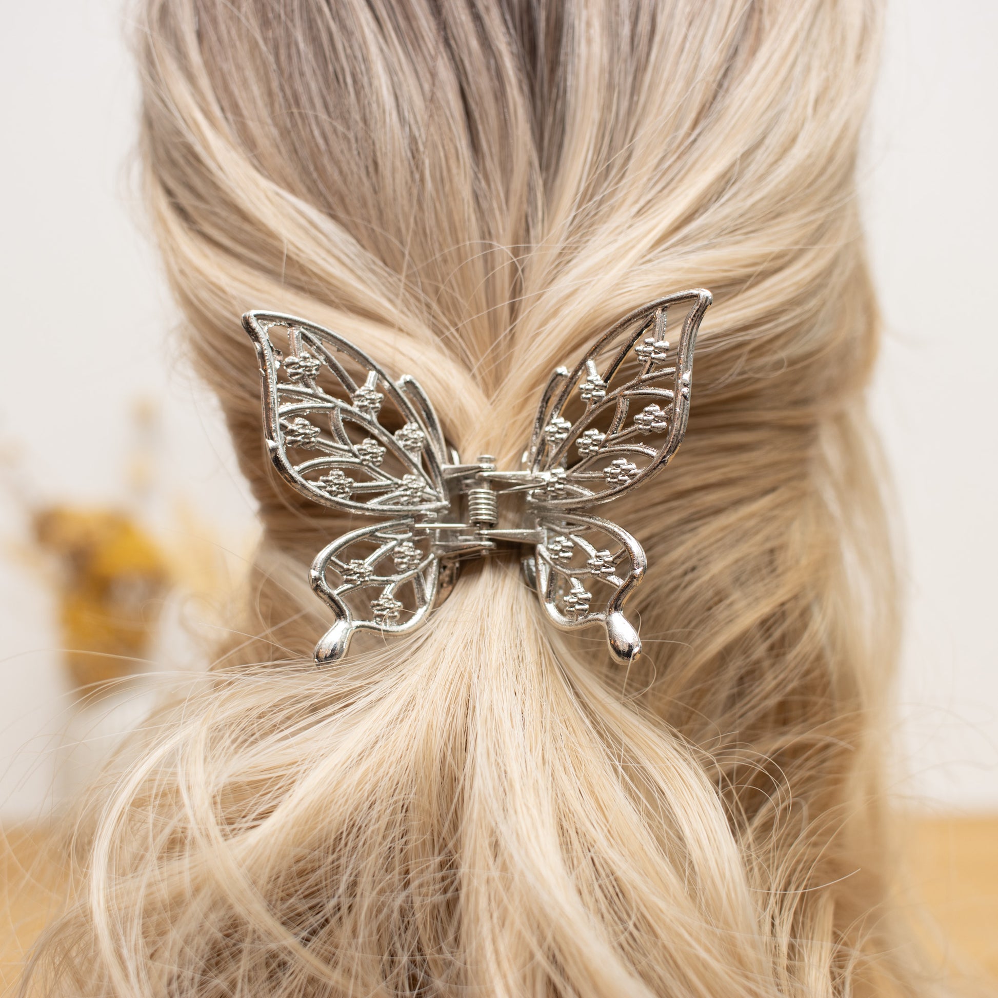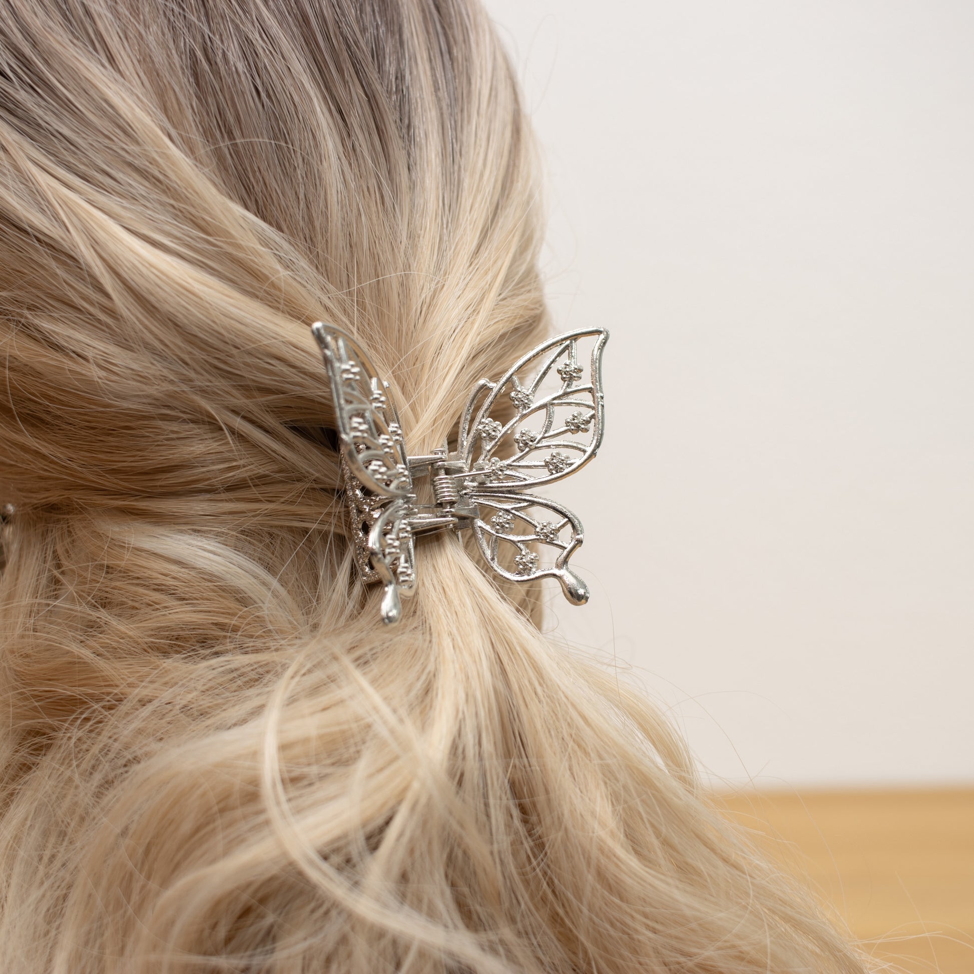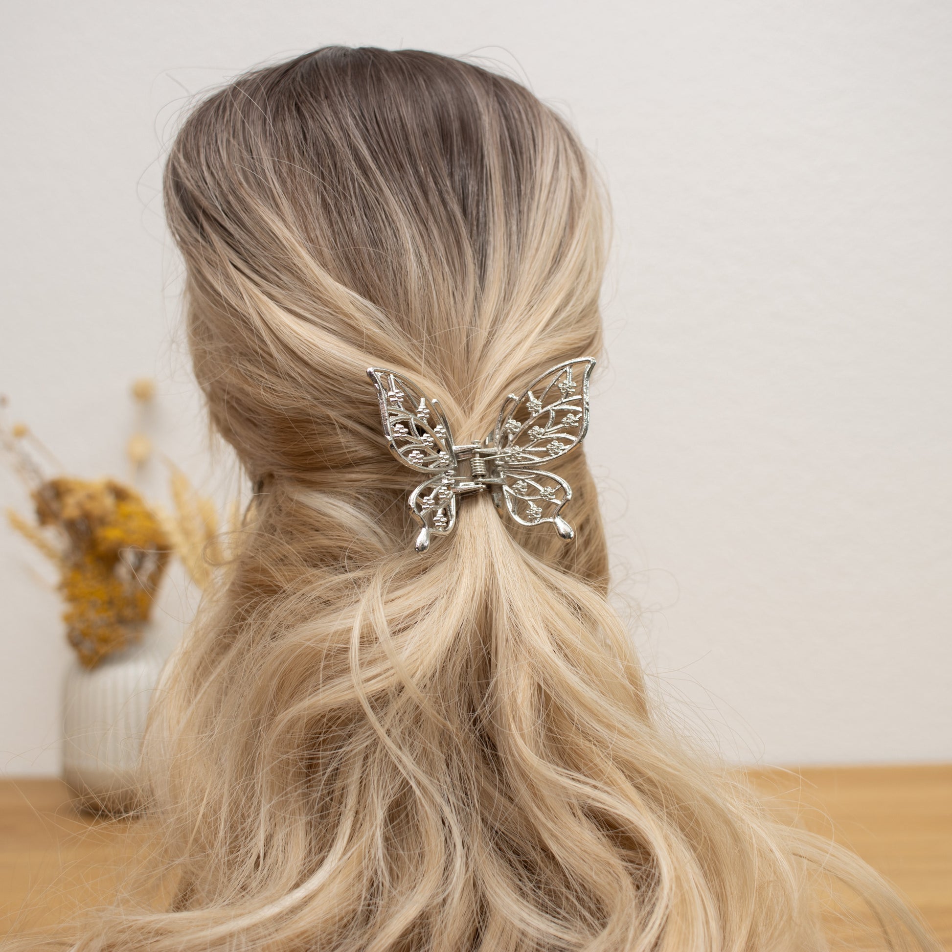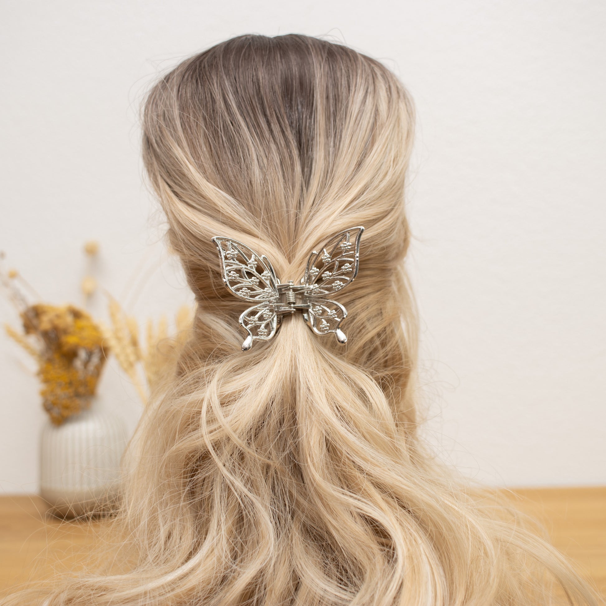 Verleihen Sie Ihrer Frisur einen eleganten und zauberhaften Akzent mit unserer Schmetterling-Haarklammer in Silber. Dieses bezaubernde Accessoire ist perfekt für besondere Anlässe und alltägliche Eleganz.